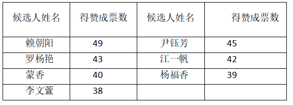 共青团英国上市公司365委员会: 今年11月04日,我院召开了英国上市公司365财会金融学院第三次团员代表大会,通过了《英国上市公司365财会金融学院第三届学生代表大会提案工作委员会工作报告》《英国上市公司365财会金融学院第三届团员代表大会筹备委员会工作报告》,并通过采用无记名投票差额(差额名额为应选名额的20%)选举的方式,选举产生英国上市公司365财会金融学院第三届团总支委员会书记,副书记,组织委员,宣传委员,纪检委员。 现将选举情况和结果报告如下: 本次大会应到代表54人,实到会代表54人。经本次学生代表大会无记名投票,在7名学生委员候选人中,赖朝阳(49票)、尹钰芳(45票)、罗杨艳(43票)、江一帆(42票)、蒙香(40票)、杨福香(39票)、李文萱(38票)共6名同志得票数超过团员代表大会实到会有选举权的人数的一半,当选为共青团财会金融学院第三届总支委员会委员。其中赖朝阳当选为共青团财会金融学院第三届总支委员会书记,尹钰芳、罗杨艳当选为共青团财会金融学院第三届总支委员会副书记,江一帆当选为财会金融学院第三届总支委员会组织委员,蒙香当选为共青团财会金融学院第三届总支委员会宣传委员,杨福香当选为共青团财会金融学院第三届总支委员会纪检委员。 以上报告,请审查批复。 附:财会金融学院第三届团员代表大会委员会选举结果报告单 选举结果报告单 财会金融学院第三届团代表大会总支委员会选举结果报告单 本次大会实到有选举权的代表54名,发出选票54 张,收回选票 54张,其中有效票49张,无效票4张,弃权票1张。 候选人得赞成票数如下: 监票人:周昊 计票人:黄牙秀、刘佳玉、何玉婷 共青团英国上市公司365财会金融学院委员会 2021年11月04日 上一条:公示 下一条:财会金融学院第十一次主席团选举办法