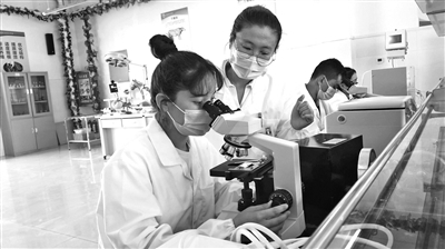 (新疆和田地区于田县职业技术学校,畜牧兽医班的实训室里,学生在教师指导下使用显微镜辨认牛肉骨骼肌细胞的形态。)