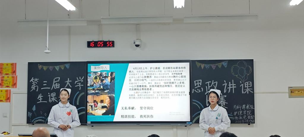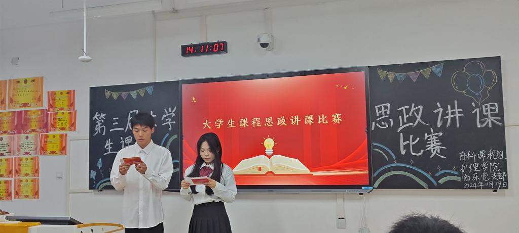 为深入贯彻落实思想政治教育在护理专业教学中的重要作用,全面提升教学质量,培养学生高尚的职业道德和深厚的爱国情怀,11月19日下午,护理学院临床党支部与内科护理课程组联合举办了第三届大学生课程思政讲课比赛。