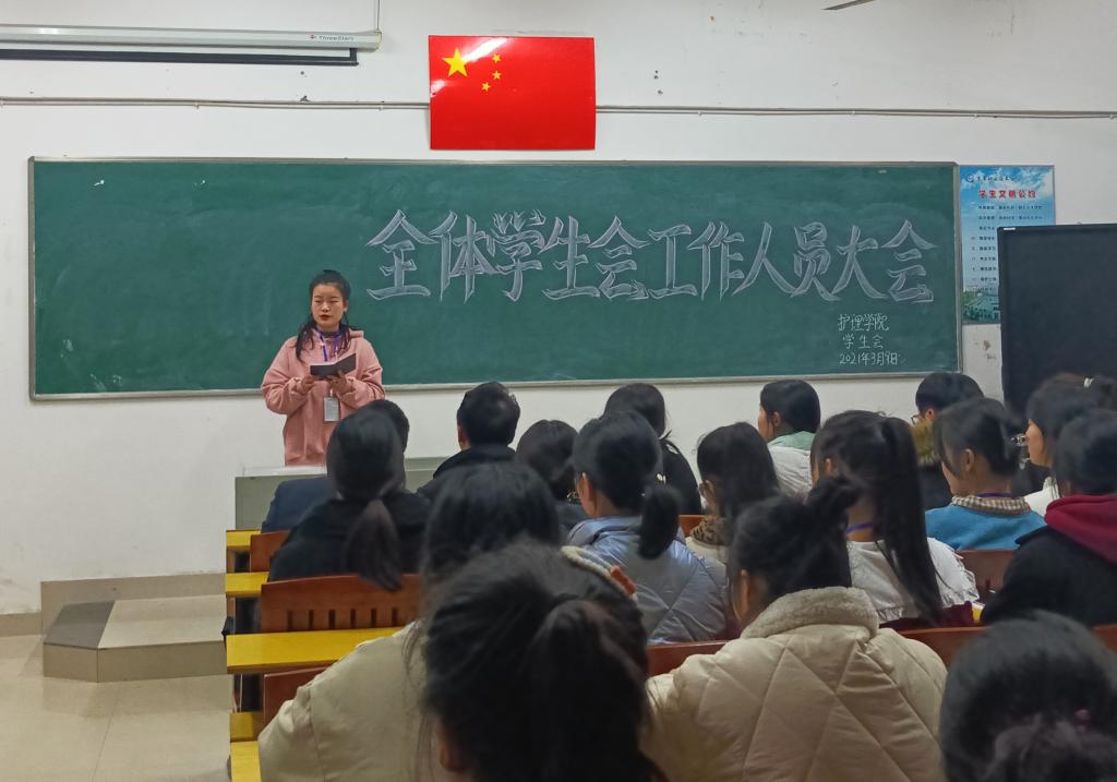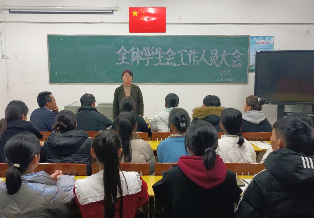 教学楼411室召开了学生会工作人员培训会。护理学院党总支书记胡蓉、副院长张蔺珊、团总支负责人刘