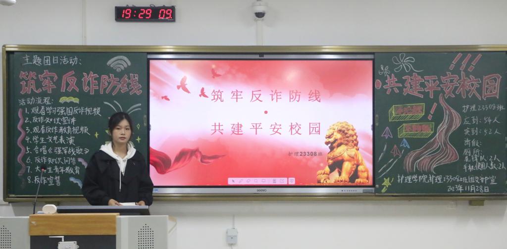 为深入学习贯彻习近平总书记关于打击治理电信网络诈骗犯罪工作的重要指示精神,提升师生反诈意识及应对能力,11月28日晚,护理学院各班开展“筑牢反诈防线,共建平安校园”主题团日活动,护理23302班为全校主题团日活动示范班级。