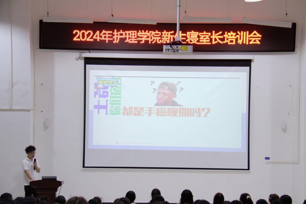 为增强学生宿舍管理的规范化水平,提升寝室长综合素质与管理能力,护理学院于9月25日在和济楼阶梯教室举办2024级新生寝室长专题培训会议。会议由学工干事胡祖昌主持。