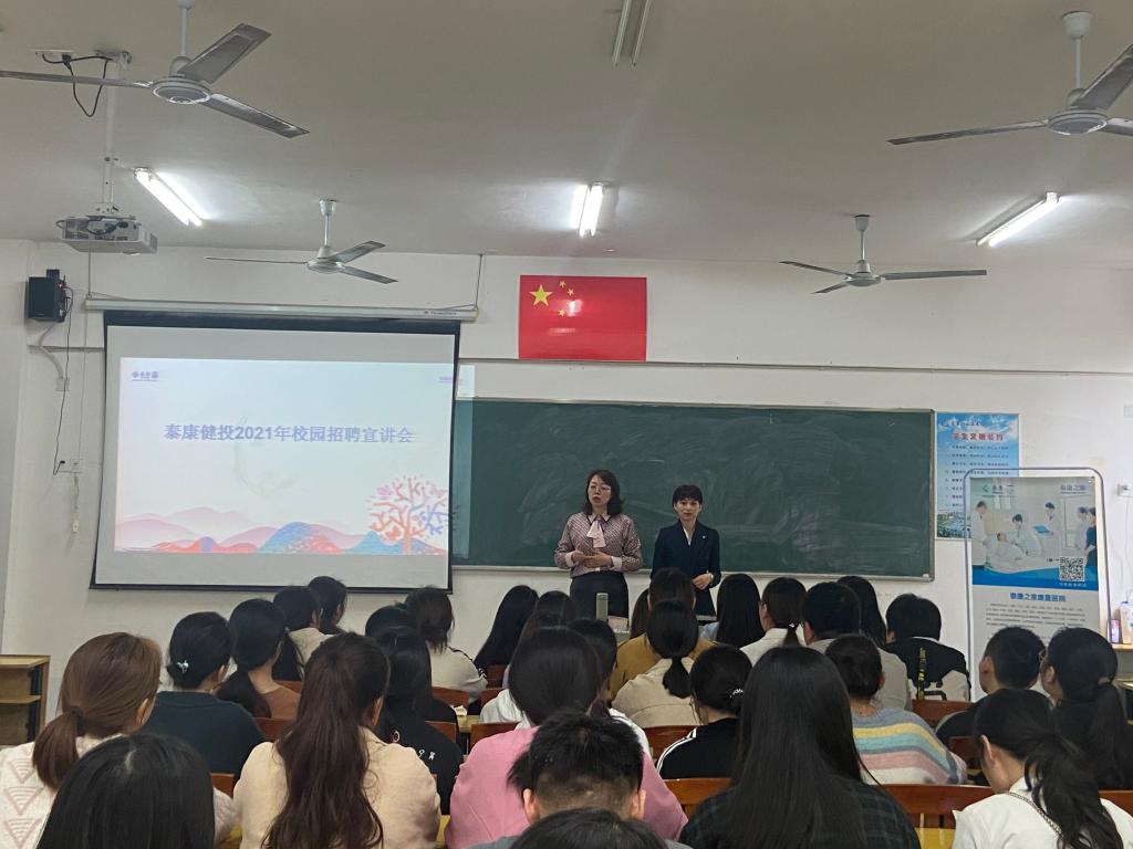 教室举办泰康之家•赣园专场招聘宣讲会,泰康健康公司人力资源总监谭蓉受邀宣讲,护理学院院长周俊