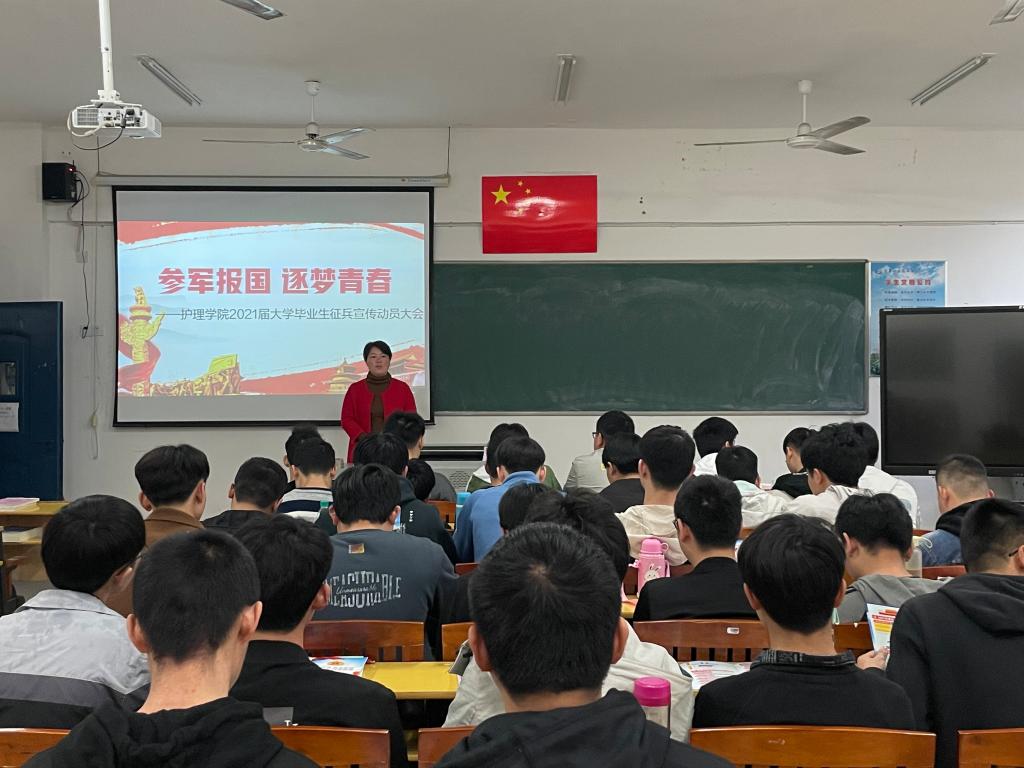 护理学院在第四教学楼411教室召开2021届大学毕业生征兵宣传动员大会,会议由护理学院党总支书记胡