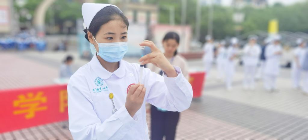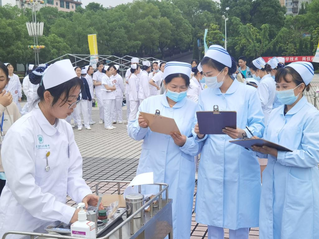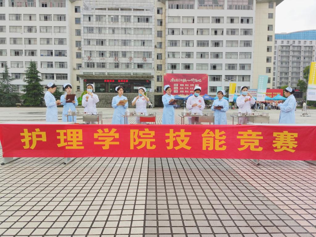 校区天使广场开展“护理教育活动周”护理技能大赛。护理学院梁芳、吴小华、刘磊、涂