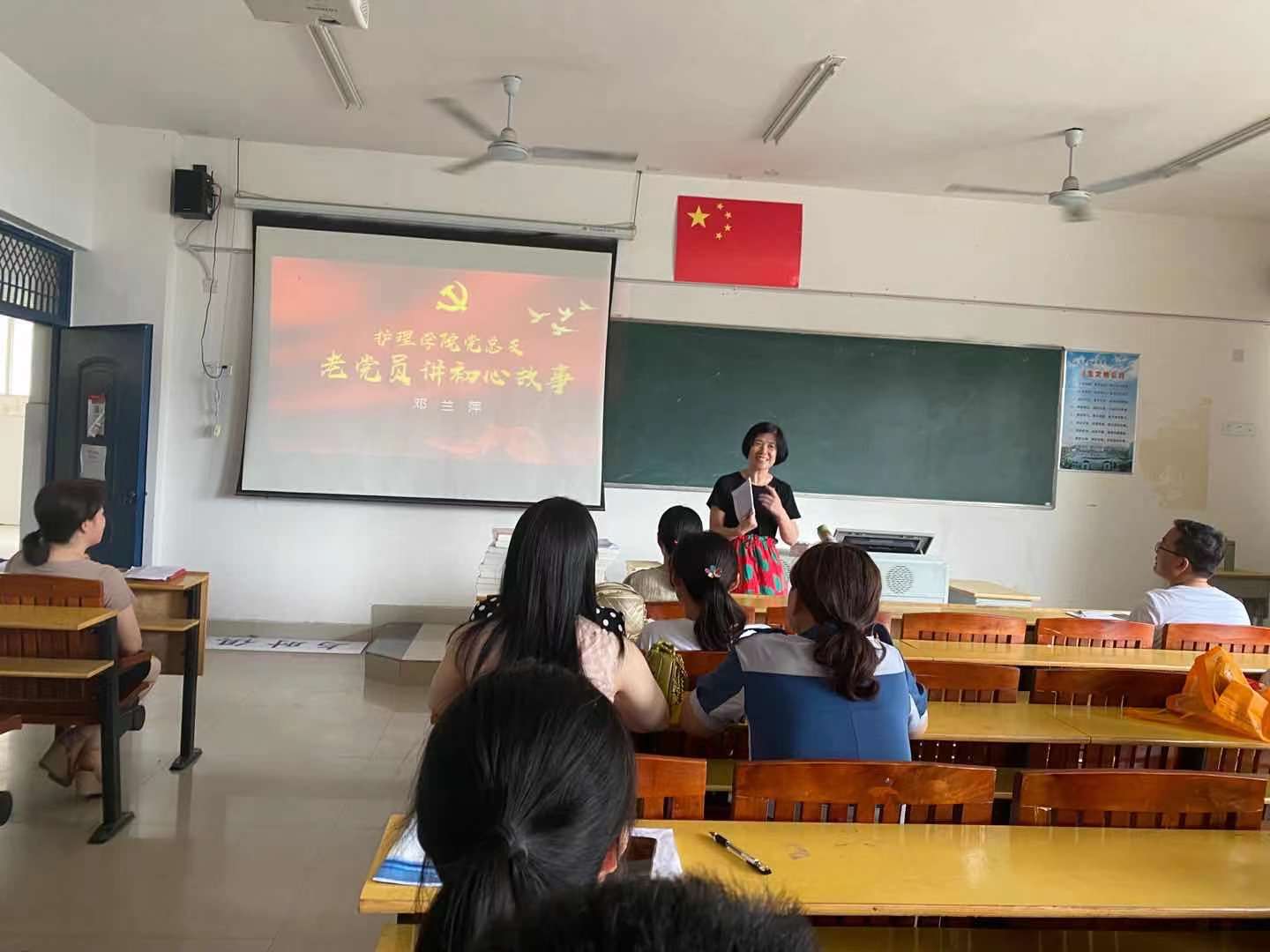 邓兰萍同志1987年10月加入中国共产党,已有35年党龄,是护理学院党总支党龄最长的党员教师。她从参加工作默默无闻讲起,讲到不怕苦不怕难,到积极参加下乡支援活动,讲到主动请战“非典”等。她说,她的初心不过是做一名普普通通问心无愧的好护士,好教师,好党员。
