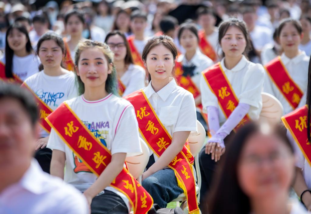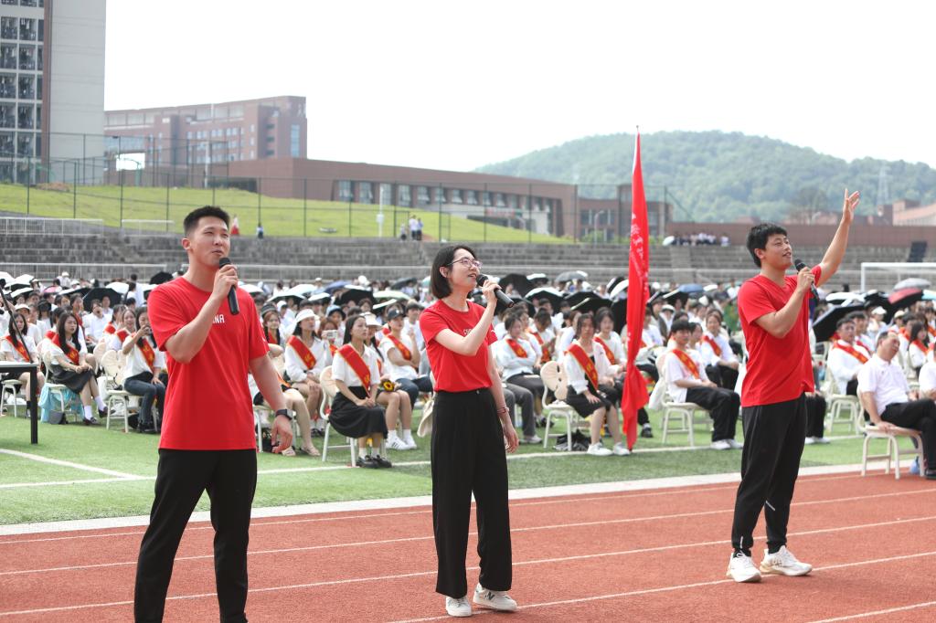 暖场结束,典礼进入正式议程环节。随着庄严的国歌声响起,全体师生肃然而立,注视五星红旗冉冉升起。党委副书记黄继斌宣读《关于表彰2023届优秀毕业生的决定》。优秀毕业生代表登台领奖,深深鞠躬,感谢母校的悉心栽培。