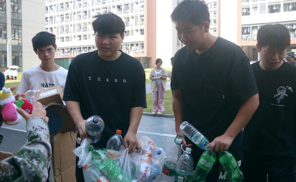 活动现场,同学们有序排队,自觉地将废弃的纸壳、塑料瓶、书本送到兑换处。志愿者们有条不紊地处理好废弃物品上的个人信息,对回收物品进行称重,根据重量来进行兑换小礼品或超市积分。
