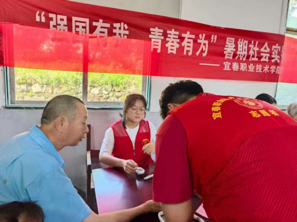 在万载县马步乡养老院,实践队的师生们带着满满的关爱走进养老院。他们与老年人亲切交谈,了解他们的生活起居和身体状况,为老年人健康体检,测量血压与血糖。同时,队员们细心陪伴老人,带领老人们练习手指操,帮助老人活动筋骨、增强体质。