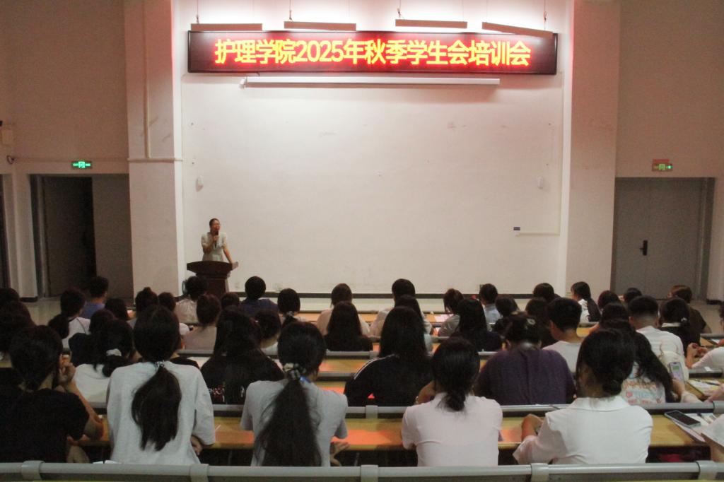 为加强学生会组织建设,提升新成员的政治素养与业务能力,增强服务同学的意识和本领,9月28日,护理学院在和济楼阶梯教室组织召开2025级秋季学生会培训会。本次培训会由学生会主席团成员张渝旋主持,护理学院团总支书记刘小三2025级全体学生会新成员及2024级学生会工作人员参加。
