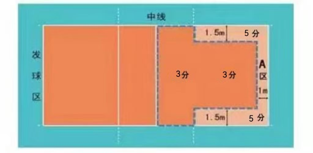 (2)评分标准:发球落点进入A区(进攻线后距离两边边线1.5米,距离端线内1米的区域),得5分;进入场地内其他区域得3分;发球失误或犯规不得分。如下图所示。