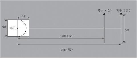 传准考试方法:如下图所示,传球目标区域由一个室内五人制足球门(球门净宽度3米,净高度2米)和以球门线为直径(3米)画的半圆以及以球门线为长(3米)、宽为2米画的长方形组成, 圆心(球门线中心点)至起点线垂直距离为男子28米,女子23米。考生须将球置于起点线上(线长5米,宽0.1米)、向目标区域先使用惯用脚连续 传球4次,再使用非惯用脚连续传球2次,脚法不限,考生须在指令发出后5分钟内完成测试。