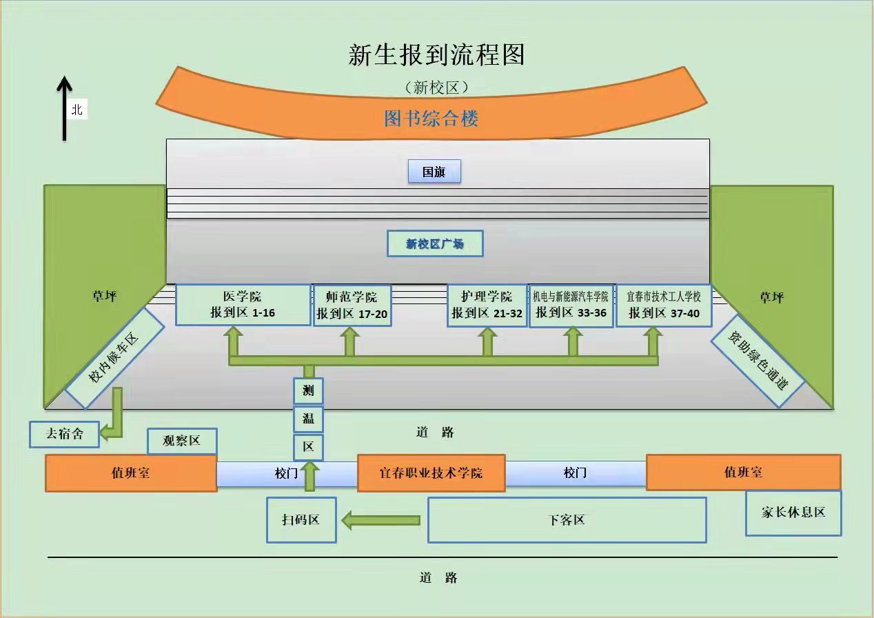 新生报到流程:校门口指定区域排队(间隔1米)→核查三码(赣通码、行程码、核酸检测报告)→行李消毒→测量体温→进入报到区域(体温正常学生)→报到→乘坐校园摆渡车到学生宿舍入住。