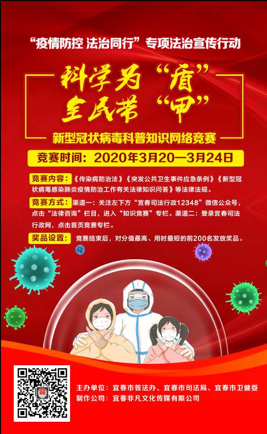 为深入贯彻省、市普法办《关于开展“防控疫情 法治同行”专项法治宣传行动工作实施方案的通知》要求,大力宣传《传染病防治法》《突发公共卫生事件应急条例》和新型冠状病毒疫情防控相关等法律法规,市普法办、市司法局、市卫健委决定开展以“科学为‘盾’全民带‘甲’”为主题的新型冠状病毒科普知识网络竞赛活动。现就有关事项通知如下。