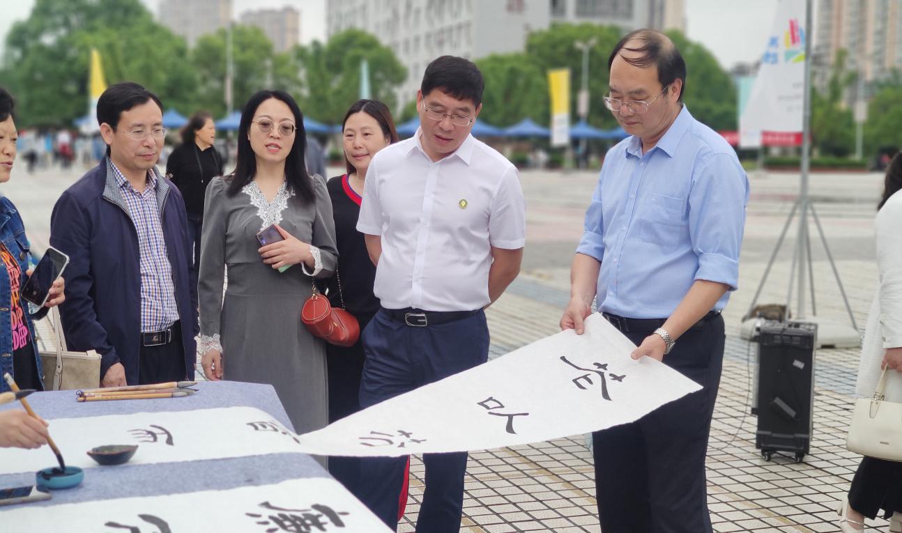 5月22日,校党委书记任军,学校党委委员﹑副校长易滨秀,学校党委委员﹑副校长刘军等一行来到艺术与设计学院职业技能周书法展示活动现场,19大美术书法班的同学正在展示“清廉文化”隶书楹联创作。