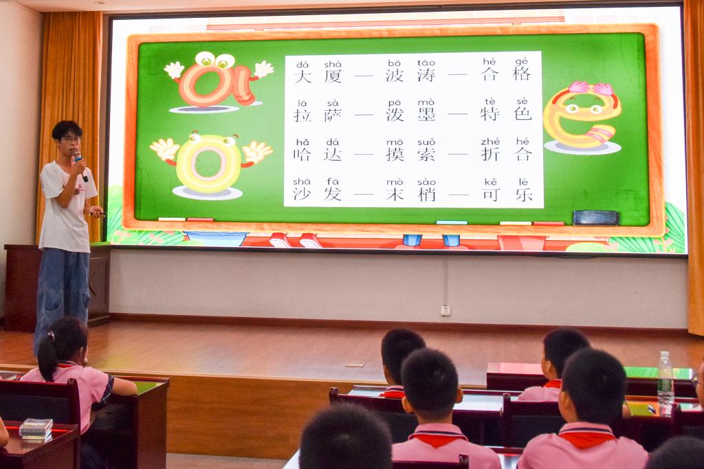 实践队从党史宣讲、推广普通话课堂、红色教育等方面开展活动。首先辅导员周思昀、霍文杰老师、徐建琳同学声情并茂的讲述了《一块红布》《两弹功勋》《满门八英烈信仰高于天》英雄伟绩,为在场的党员、学生、群众展现了中国共产党百年奋斗的光辉历程和革命先烈、英雄模范的感人事迹,激励着大家从百年党史中感悟思想伟力、汲取奋进力量。紧接着,实践队为现场23名小学生进行了专业的普通话训练教学,口部操、气息训练、字词纠正、绕口令和即兴表达,环环相扣,逐步深入,引导孩子们从口腔、气息、字词到句意表达,完成一个完整的语言体验。同时,课堂上师生们还融入了朗诵、民族舞蹈、书法展示、乐器弹唱、趣味游戏等活动,孩子们聆听、模仿、演示、PK,丰富多彩、妙趣横生的课堂让他们在学习知识的同时,也收获了欢乐。最后,实践队成员与孩子们一起,手持小红旗,合唱歌曲《红星歌》,庆祝党的百年华诞,倾诉着红心向党的赤诚之情。课堂之后,实践队成员又马不停蹄的来到定江社区进行走访调研,沿街挨户地发放普通话推广公益宣传单,向居民介绍推广普通话的意义,引导居民在日常生活中规范使用普通话等,用实际行动助力美丽乡村的建设。