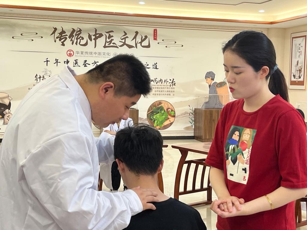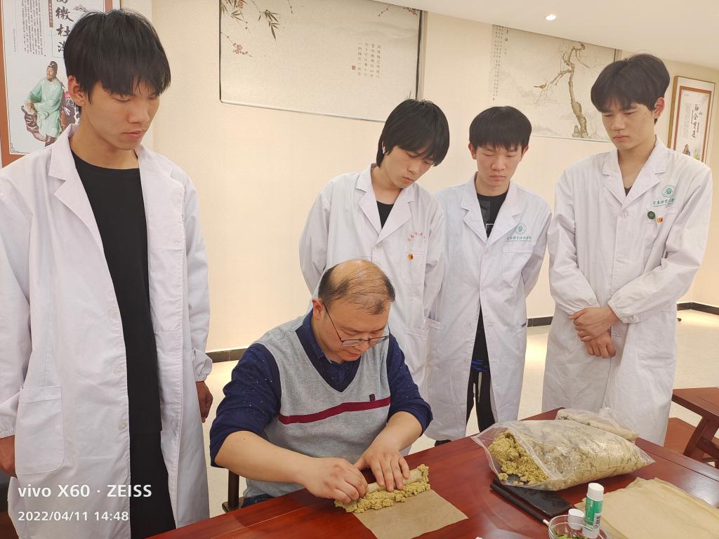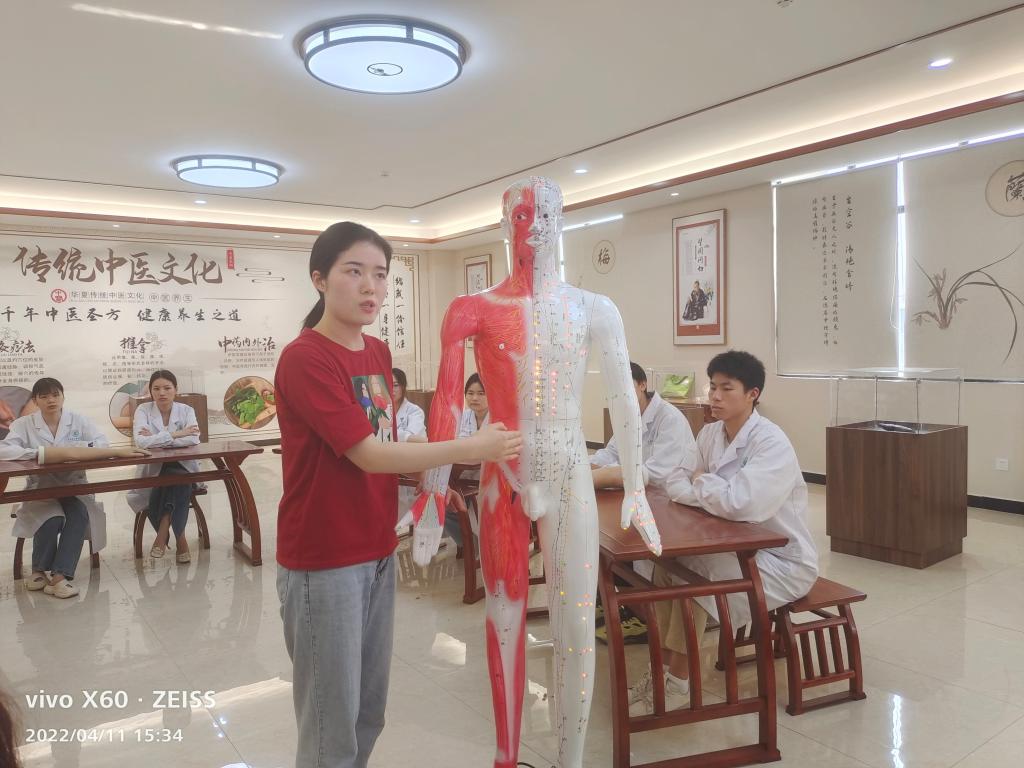 首期开放课堂的主题为艾灸与经络养生,授课语言为中文和英文,充分展现了中医康养之神奇。康复治疗技术专业的宁松兵老师阐述了艾灸在中医康复和养生保健领域的独特魅力,现场指导学生们制作艾条,并使用艾条在“患者”四个穴位上施治,展示艾灸在温经通络、散寒祛湿、补养气血方面的疗效;刘佳老师阐述中国传统医学的整体观念、经络系统的概念组成,并在宋思清老师的悉心协助下,示范示范常见病症在经络腧穴的治疗,在“患者”体表找到相应的穴位进行按揉刺激、促进气血运行,以达到养生保健应用方面的功效。