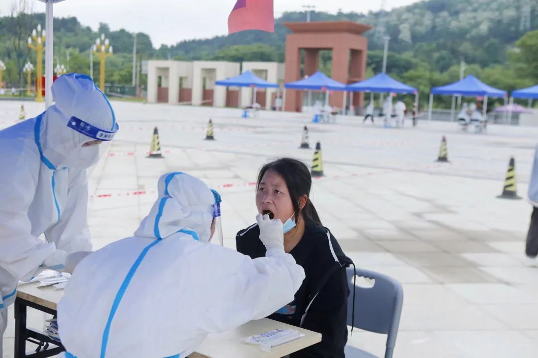 核酸检测现场,在校教职员工、学生等按照防疫要求佩戴好口罩、保持一米间隔距离,经查验健康码、测温、扫描核酸检测码后,分20人一组依次进行口腔咽拭子标本采样,采样结束后师生们迅速离开现场,避免人群聚集。