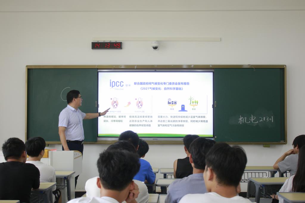 本站讯(机电与新能源汽车学院 苏文海)为响应国家双碳经济战略目标,助力宜春双碳人才培养,6月10日下午,党委书记任军在正心楼B118教室为机电21301班学子讲授了题为《打好实现碳达峰碳中和这场硬仗》的“形势与政策”课。
