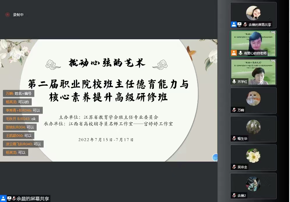 本站讯(辅导员 刘小三)为进一步学习贯彻习近平总书记关于教育的重要论述及全国教育大会精神,《职业教育提质培优行动计划(2020—2023 年)》、《国家职业教育改革实施方案》等文件精神,围绕“立德树人”根本任务,探索新时代辅导员、班主任队伍建设的新机制、新途径、新方法,提升英国上市公司365辅导员、班主任专业素质,提升德育工作水平和育人质量,7月16-17日英国上市公司365辅导员工作室参加由江苏省教育学会班主任专业委员会、南京师范大学班主任研究中心主办、江西省高校辅导员名师工作室——“宫婷婷工作室”承办的“拨动心弦的艺术”——第二届职业院校班主任德育能力与素养提升高级研修班。