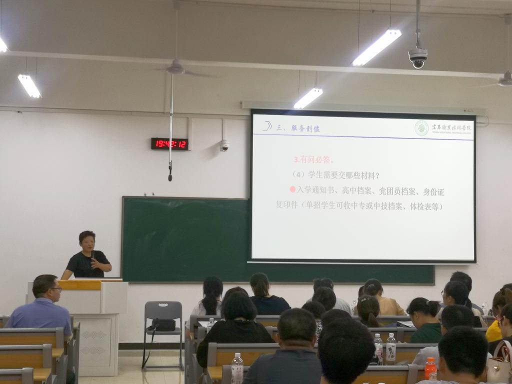 接着,学工处处长谢海英作了《辅导员(班主任)如何做好迎新工作》专题培训。她提出了四个到位:一是认识到位,要把迎新工作当成一件喜事、一件大事来做,全身心投入;二是准备到位,物品材料到位、宿舍到位、教室到位、志愿者到位,要提前做好功课;三是服务到位,要热情接待,坚守岗位,做到有问必答,做好学生和家长的服务工作;四是防控到位,坚持督促学生做好疫情防控的各项工作。最后她对班主任提出了五个严禁,希望大家自觉遵守,共同努力做好今年的迎新工作。