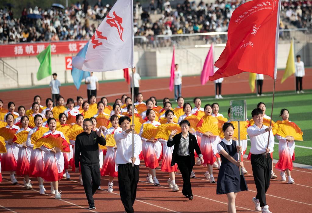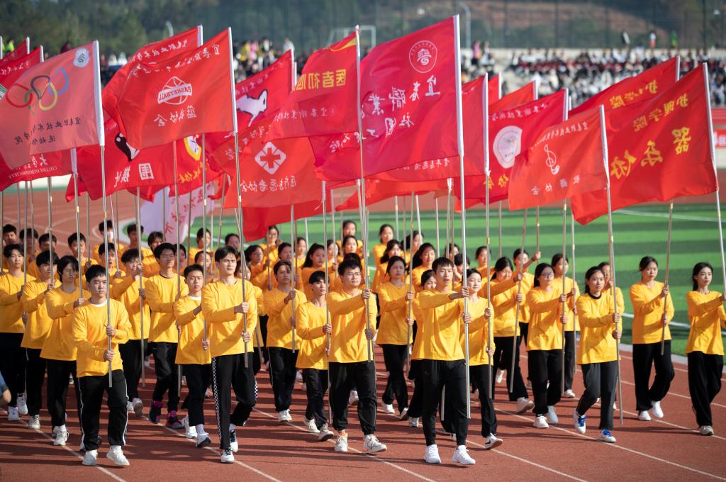 紧随其后的是各学院代表队。护理学院代表队手持红黄两色绸扇翩翩起舞,白衣天使展翼赛场;医学院代表队由身着戎装的退伍军人担当旗手,威武军礼,尽展蓬勃风貌;师范学院代表队手捧鲜花自信走来,如园丁呵护祖国的花朵,“四有好老师”的风范尽显其中;艺术与设计学院代表队着一袭白纱于红绸中飞舞,如同晚霞下的天鹅,轻盈曼妙……各院代表队相继登场,绸扇、翻花、彩带、无人机……造型多样,各具特色。他们脚步坚定,口号铿锵,势以奋斗之姿在本次运动会中彰显青春之貌。