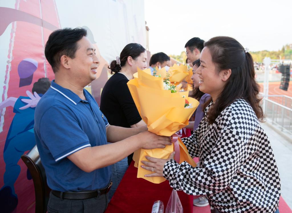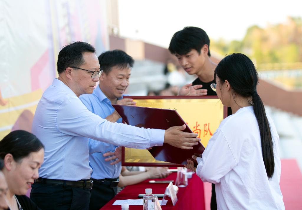 闭幕式伊始,军事体育部副主任、总裁判长谢坚宣布本届校运会团体总分获奖名单、道德风尚奖名单、入场式表演获奖名单。在激昂的音乐声和热烈的掌声中,获奖学院代表依次走上主席台,接受颁奖。军事体育部主任周军华宣布运动会突出贡献个人名单。校领导为突出贡献个人献上鲜花,感谢他们为本次运动会做出的积极贡献和不懈努力。