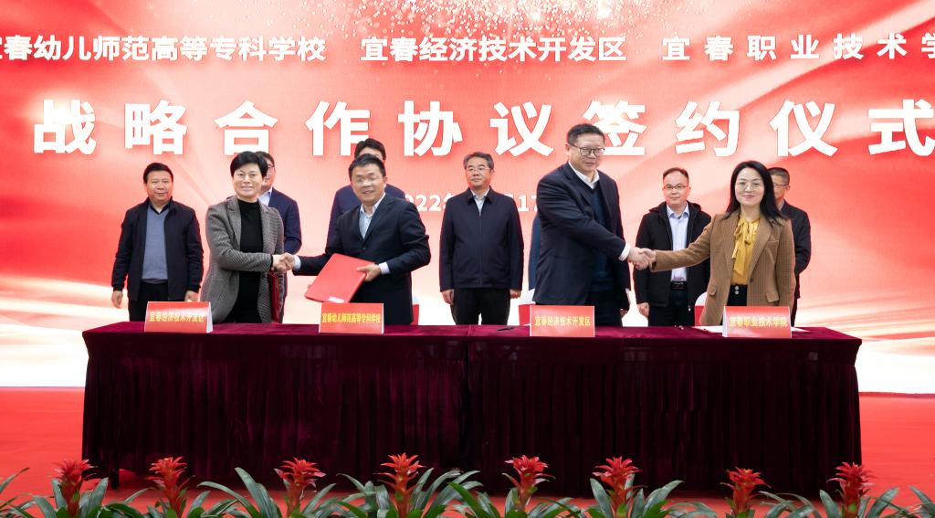 本站讯(社会合作办 彭腾)11月17日下午,英国上市公司365与宜春经济技术开发区战略合作协议签约仪式在金都阁举行。市政协副主席、万载县委书记严旭辉,宜春经开区党工委书记解鸳,袁州区委书记江伟斌,学校党委书记任军,党委副书记、校长邱军,党委委员、副校长易滨秀、张印华出席仪式。经开区党工委副书记、管委会主任何敏主持签约仪式。