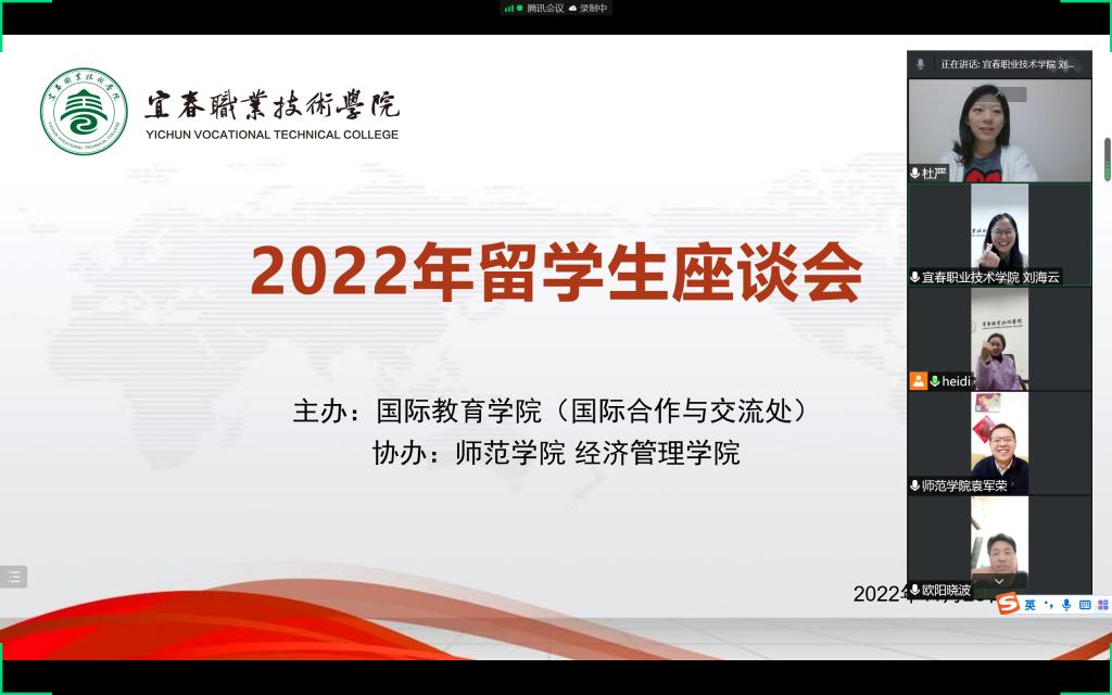首先,刘海云通过诵读江西高校外籍师生热议二十大的发言引导留学生通过学习党的二十大精神了解中国的历史、中国文化、了解中国促进世界和平与发展的理念等。她对同学们说,江西高校很多外籍师生都表示被江西山水所吸引,相信同学们来到宜春也会被宜春的山水所陶醉,也更能深入理解“绿水青山就是金山银山”的理念。接着,留学生们对现在的教学、班级管理等方面提出了意见与建议,大家一致对现在的教学及班级管理很满意,期待能尽快返校,和同学们一起进行线下学习,提高学习效率,同时更好地融入班集体;袁军荣、欧阳晓波希望留学生们认真进行网课学习、按时高质量完成老师布置的作业,争取期末考试取得更好的成绩;江萍就留学生返校事宜进行了说明;最后,刘海云表示,期待和同学们在美丽的校园见面,祝福同学们学习不断进步