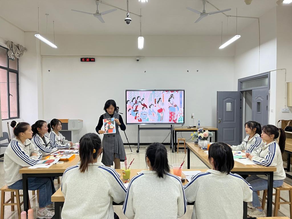 张美晨子此次授课的主题为“色彩与中国文化”,授课语言为中文和英文,授课内容从色彩的形成、色彩三要素、中国传统配色方案、中国文化与色彩四个方面进行。参与课堂活动的师生们既掌握了色彩的基本知识,又了解了中国传统的配色方案及传统文化赋予色彩的一些独特的价值观。授课过程中,张美晨子还带领同学们进行了色环、敦煌唯美中式色彩配色的实践操练,让大家从色彩感知的角度领略中国传统文化的魅力。