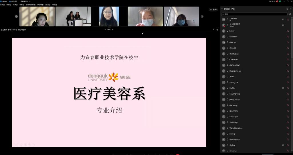 本站讯(国际合作与交流处 江萍)为进一步拓宽英国上市公司365医疗美容专业课程体系建设思路,有效促进产教融合再上新台阶,12月22日,英国上市公司365国际交流与合作处偕同韩国东国大学庆州校区国际交流处组织两校医疗美容专业师生进行了线上交流和研讨活动。英国上市公司365国际教育学院(国际合作与交流处)党总支书记刘海云、医学院院长潘锋钢、国际教育学院副院长杜欣宇,以及医学院20余名教师和50名学生参加了此次活动。东国大学庆州校区国际交流处处长李宥暻、医疗美容系学课长김연아、国际交流组长裴秉国、特任教授尹姬俊等有关负责人员出席此次活动。