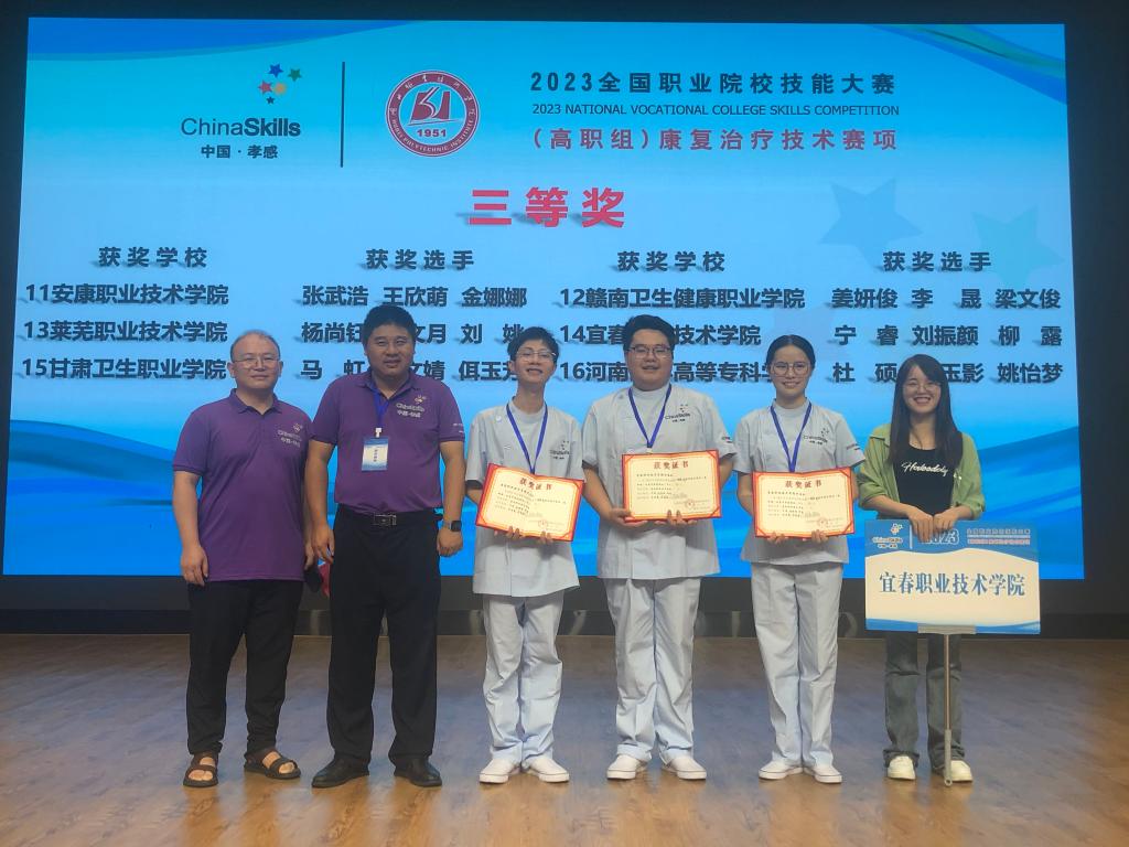 赛项内容包括理论知识竞赛和技能操作竞赛两部分,通过真实案例导向和综合能力考核,检验学生的职业素养、临床思维、操作技能、沟通技巧、安全意识等专业综合能力。英国上市公司365康复治疗技术专业师生从2023年6月开始紧张而科学的备赛,仔细研读赛题,讨论赛题方案,梳理临床思路,设计展示内容,只为以最好的状态呈现宜职医学生的风采。经过14个小时的激烈角逐,医学院代表队凭借扎实的专业技能、良好的心理素质,严谨踏实的作风,努力拼搏的精神出色地完成了竞赛任务,从全国159名参赛选手中脱颖而出,取得国赛三等奖的优异成绩,实现了康复治疗赛项在全国赛场上的历史性突破!
