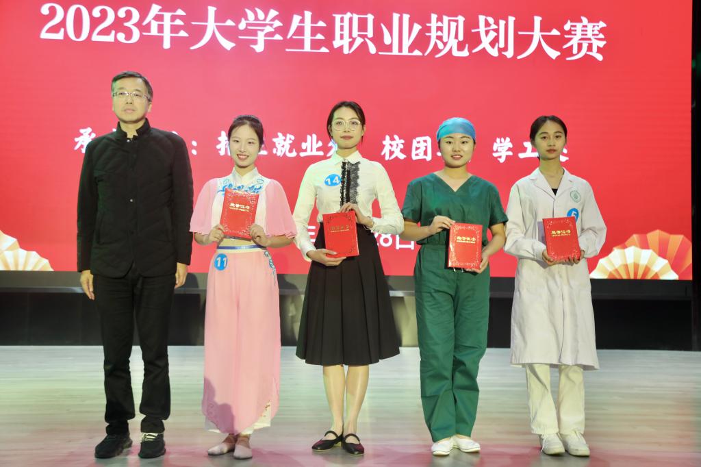 评委们根据选手的职业规划合理性、目标设定清晰度、行动计划可行性以及现场表现等方面进行综合评判。经过紧张激烈的角逐,最终评选出成长赛道金奖2名、银奖3名、铜奖5名;就业赛道金奖2名、银奖2名。校领导及招生就业处处长彭艳飞为获奖学生颁奖。