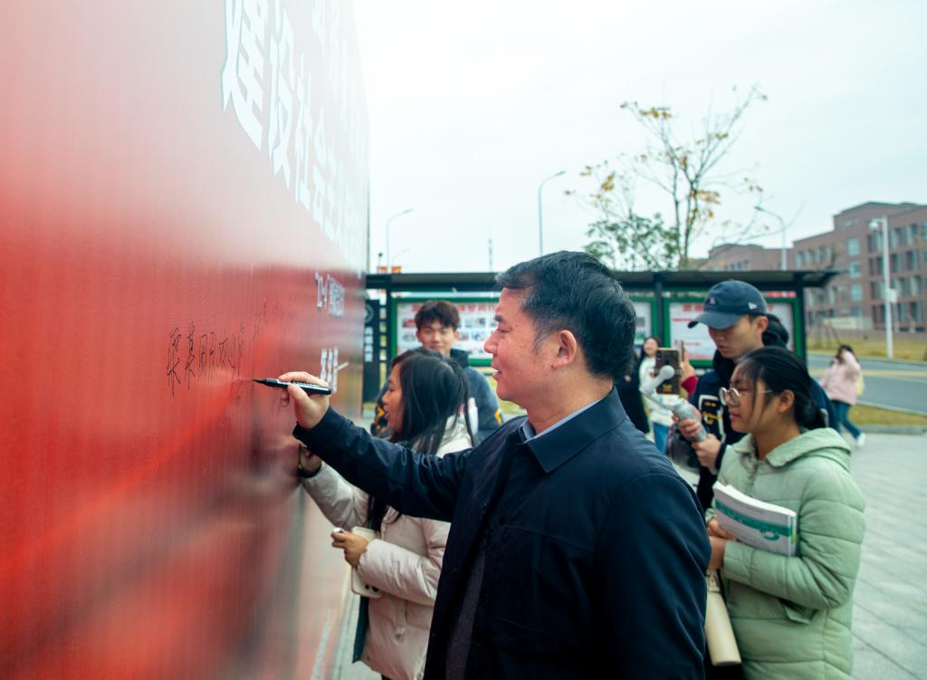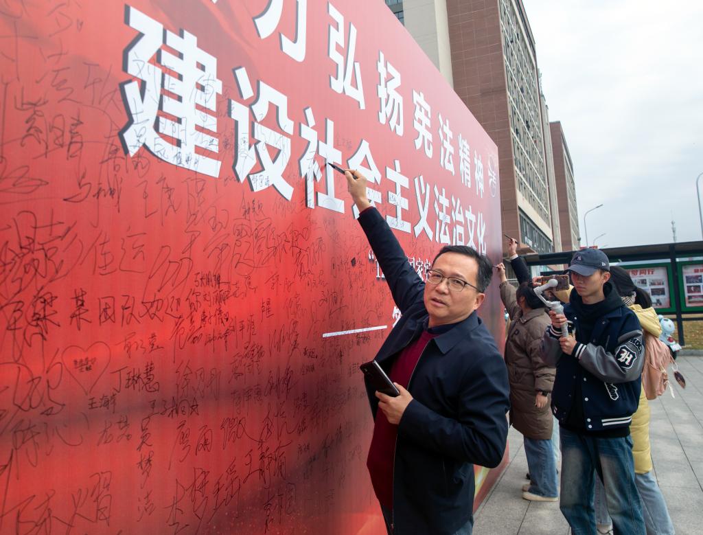 “这道题我知道,国家宪法日是12月4日!”“回答正确!去抽取礼品吧。”12月4日中午,英国上市公司365在东区食堂门口开展宪法知识有奖竞答活动。活动期间,现场气氛热烈,人潮涌动。党委书记任军等校领导来到现场,与同学们亲切交谈,并带头在签名墙上签上自己的姓名。师生们积极答题、抽奖,手持打卡牌合影留念,纷纷拿起笔在签名墙上严肃认真地签上自己的名字,以庄重的仪式感表达对宪法的尊崇、维护。工作人员为往来师生发放《中华人民共和国宪法》读本,鼓励同学们要学好法律专业知识,将来为法治中国作出贡献。
