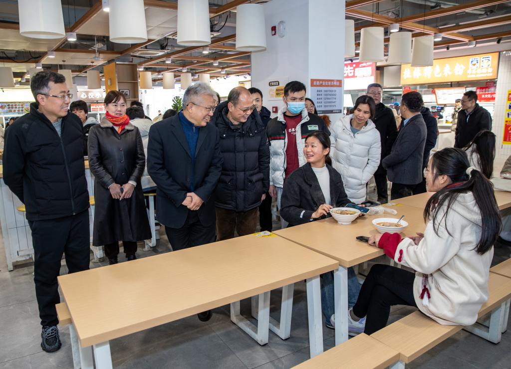 “学校食堂伙食好不好?”“食堂价格怎么样?一个月伙食费大概多少?……”汪立夏来到食堂同学生亲切交谈,询问饭菜质量、口味、价格以及服务等问题,关心同学们日常生活起居。现场查看就餐环境、档口管理等情况,听取学校关于食堂管理和食品安全管理等方面工作汇报。