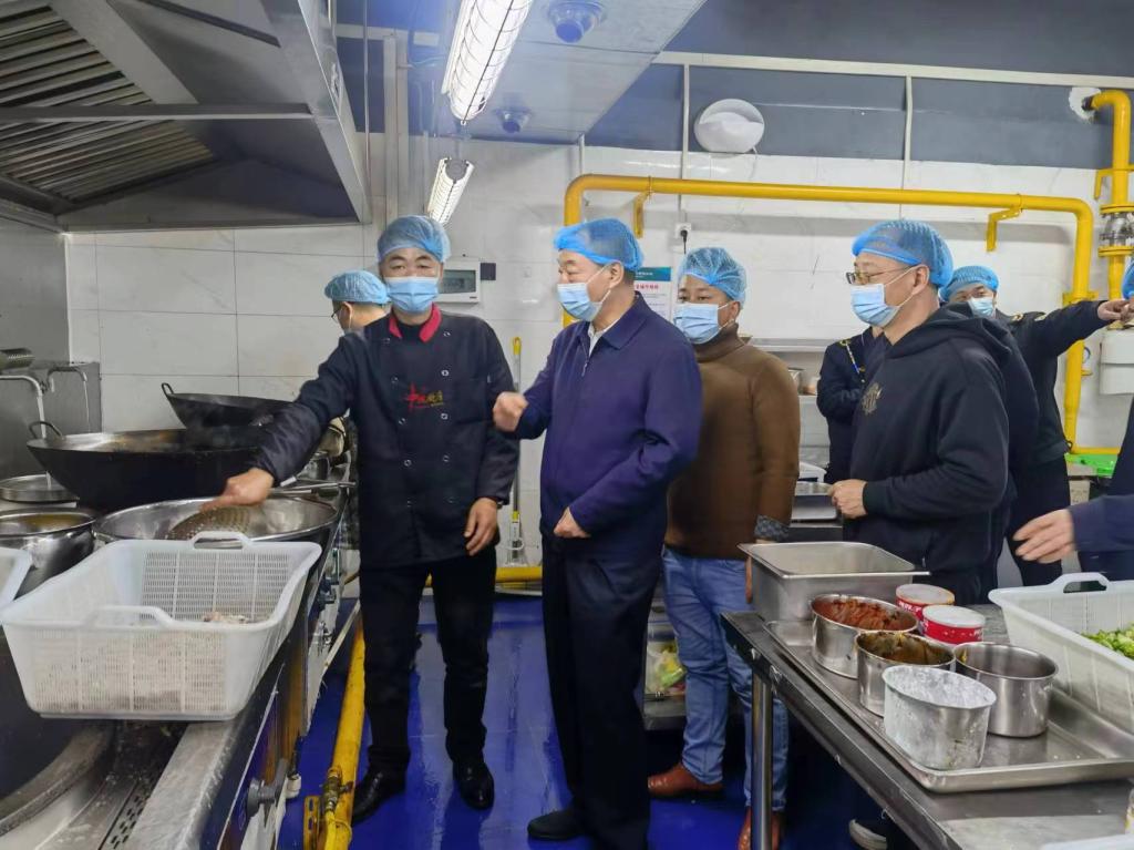 夏红色一行到学校后直奔东区一楼众源公司食堂后厨,查看从业人员健康证、食材采购记录、环境卫生、加工过程注意事项、用水用电用燃气的安全。现场与厨师交流,提出要确保饭菜质量、荤素比要适合、调味品使用要按要求存放、生熟菜要按要求存放等。在售卖区域交代从业人员要把学生当作是自己的小孩看待、服务态度要好、按要求穿戴好。他还现场询问学生饭菜价格、质量口感,叮嘱学生不要浪费粮食。