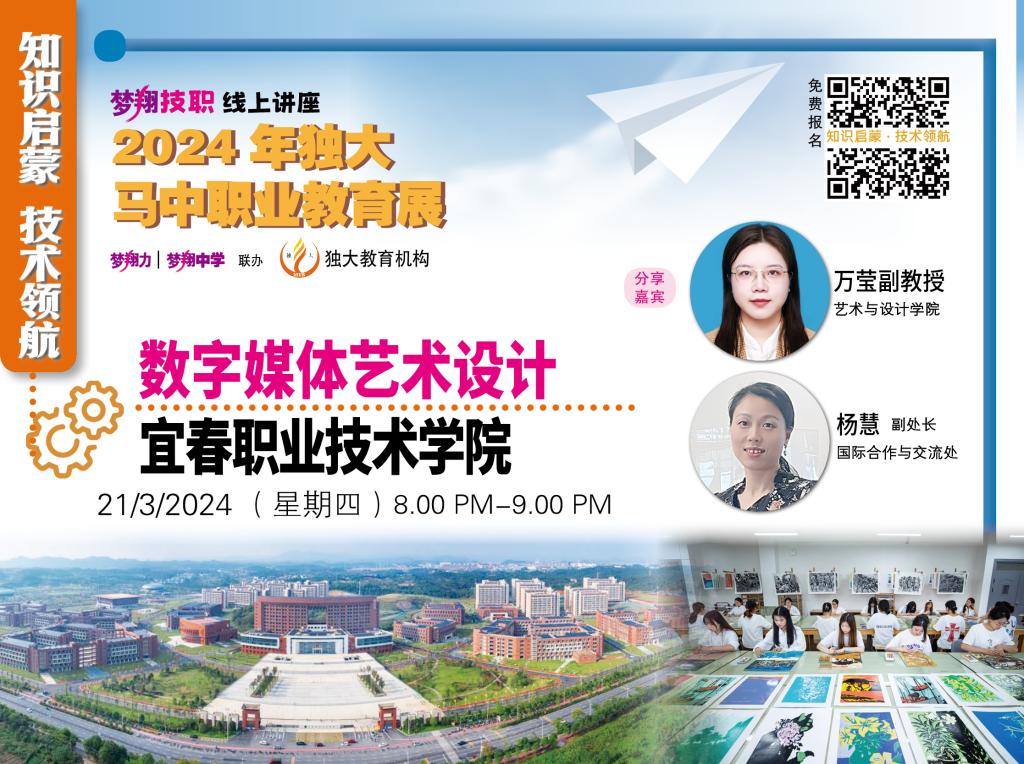 本站讯(国际合作与交流处 杨慧)全面展示学校办学特色及专业特点,吸引优质海外生源,3月21日晚,校国际合作与交流处副处长杨慧、艺术与设计学院副教授万莹应邀参加由马来西亚独大教育中心与梦翔力生涯教育工作室联合主办的2024年“职教育才·工艺兴邦”线上讲座。梦翔力生涯教育工作室主编林晓薇主持此次讲座,近100名马来西亚家长及学生听取讲座。