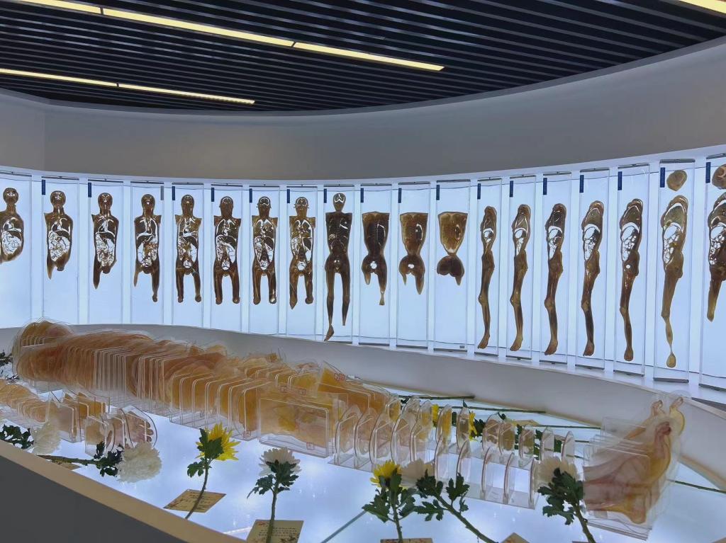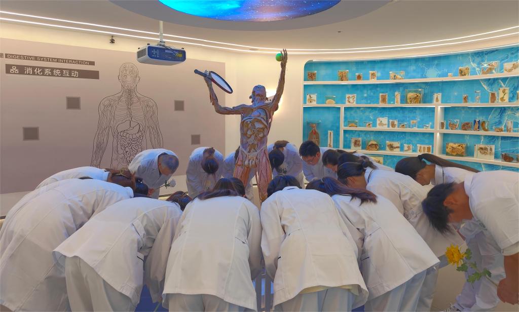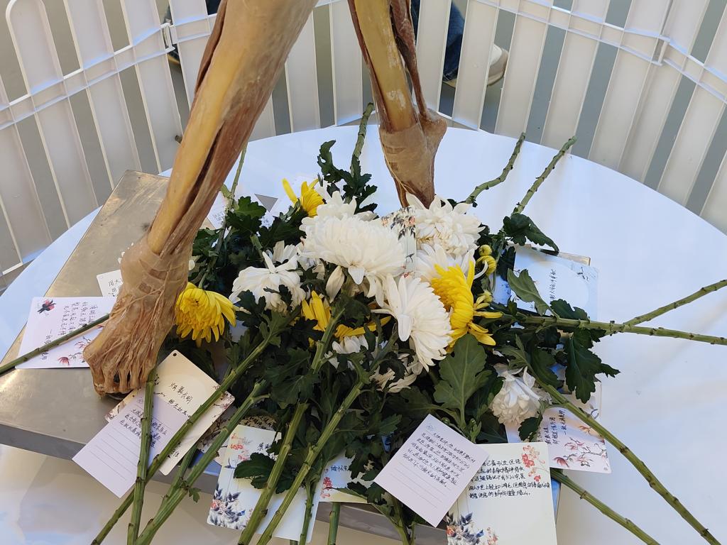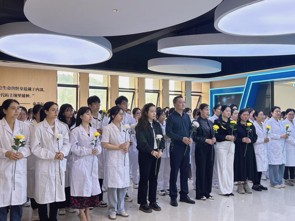 当日,大家怀着敬畏、虔诚之心来到生命与健康科学馆感恩区、断层区、消化区和运动区的4位大体老师处,依次默哀一分钟,行三鞠躬礼,献上鲜花和感恩卡,以深切缅怀大体老师,向他们致以最崇高的敬意。同学们通过致感恩辞、诗词朗诵和重温医学生誓言等方式表达对大体老师感恩、追思之情,抒发牢记使命,努力做党和人民信赖的好医生的拳拳之心。