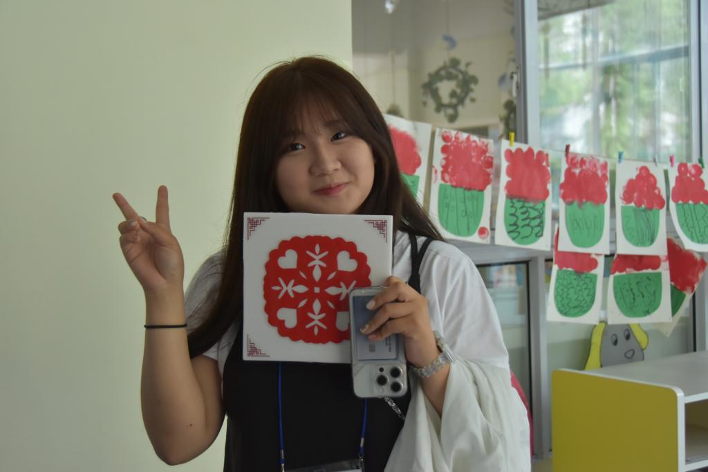 在校国际教育学院钟菊英老师、校国际合作交流处副处长杨慧、鲲鹏幼儿园园长颜美珍的陪同下,研学团认真聆听小小解说员对本园基本情况的讲解,参观美丽、完善的园所环境,在幼儿园专业美术教师的指导下,学习和体验中国传统文化——剪纸,并带回即兴创作的剪纸作品作为纪念。接着,他们观看了富有宜春特色的舞蹈《宜春童谣》、花样跳绳、幼儿早操和音乐课《无声的律动》,还与幼儿进行亲密互动。浓郁的传统文化氛围,美丽的学习生活环境处处蕴含教育价值、教育功能,幼儿精彩的表现、讲解和表演的落落大方,与教师有趣的教学方式,令研学团赞不绝口,对中国传统文化艺术的魅力感慨万分。