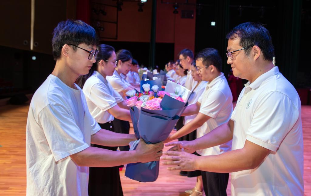 发强刚毅,生生不息。“为学校发展、为社会进步、为中华民族的伟大复兴贡献智慧和力量!”新入职教师们在丁晓景老师的带领下,举起右拳,庄严宣誓。10对师徒上台,举行新入职教师拜师仪式,徒弟向师父献花并行礼。