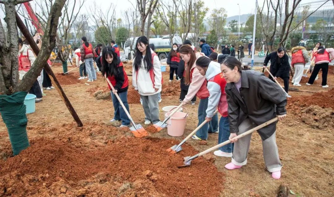活动当日,微风轻拂。师生们热情高涨,早早来到植树区域,手持铁锹、水桶等工具,迅速投入到植树活动中。大家分工协作、干劲十足。挥锹铲土、扶苗培土、提水浇灌……默契配合,将一棵棵新苗稳稳扎根土壤。校领导们参与到植树劳动中,与师生们一同挥锹铲土,为树苗培土浇水,现场气氛热烈而温馨。经过大家的共同努力,62 棵樱花、桃树和李树顺利扎根校园。