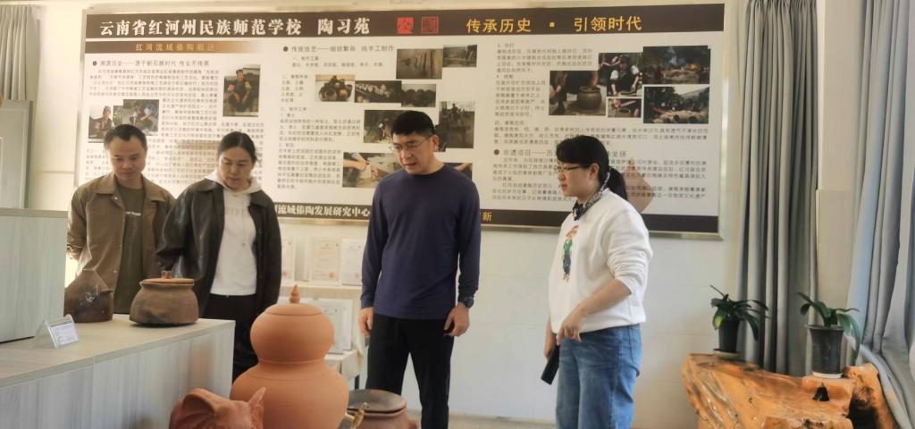 随后,团队重点考察了红河州民族师范学校的紫陶产业学院。在国家级非遗建水紫陶传承基地,任军一行观摩从陶土采集到成品烧制的完整产业链流程。紫陶产业学院通过“校中厂”模式,将生产实践融入教学过程,实现了人才培养与产业需求的无缝对接。这一灵活的运行机制不仅提升学生的实践能力,也为产业发展提供有力的人才支撑。