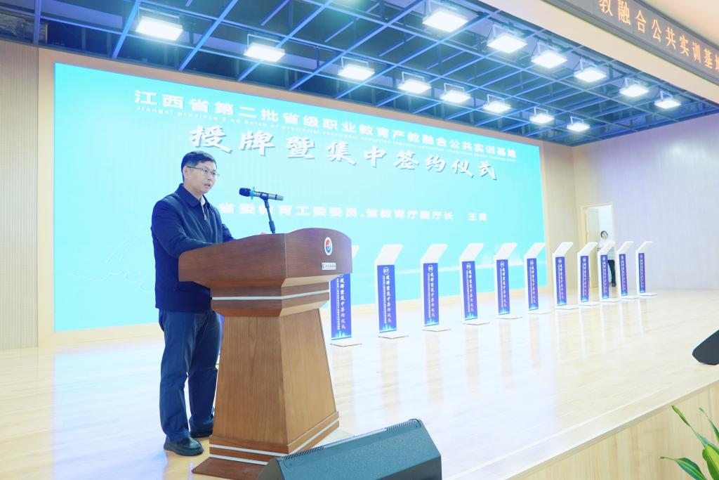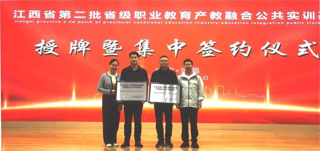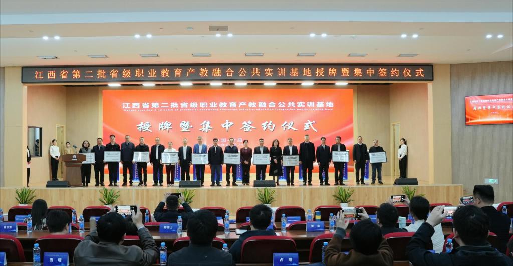 本站讯(社会合作办 彭腾)3月28日,江西省第二批省级职业教育产教融合公共实训基地授牌暨集中签约仪式在江西人才会议中心举行。本次活动由江西省教育厅、江西省国资委主办、江西省人才发展集团承办,汇聚全省职业教育与产业界精英。校党委委员、副校长刘叶建率社会合作办主任文欢、护理学院党总支书记吴少林、机电与新能源汽车学院党总支书记赵琰出席仪式,代表学校接受“锂电新能源产教融合公共实训基地”“智慧医疗产教融合公共实训基地”两项省级荣誉授牌。