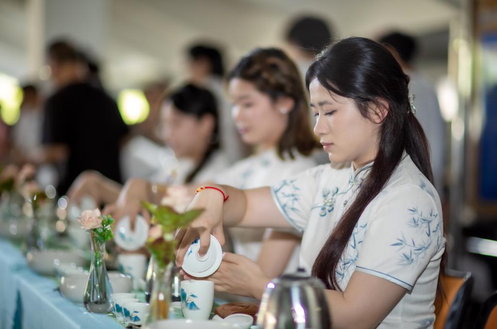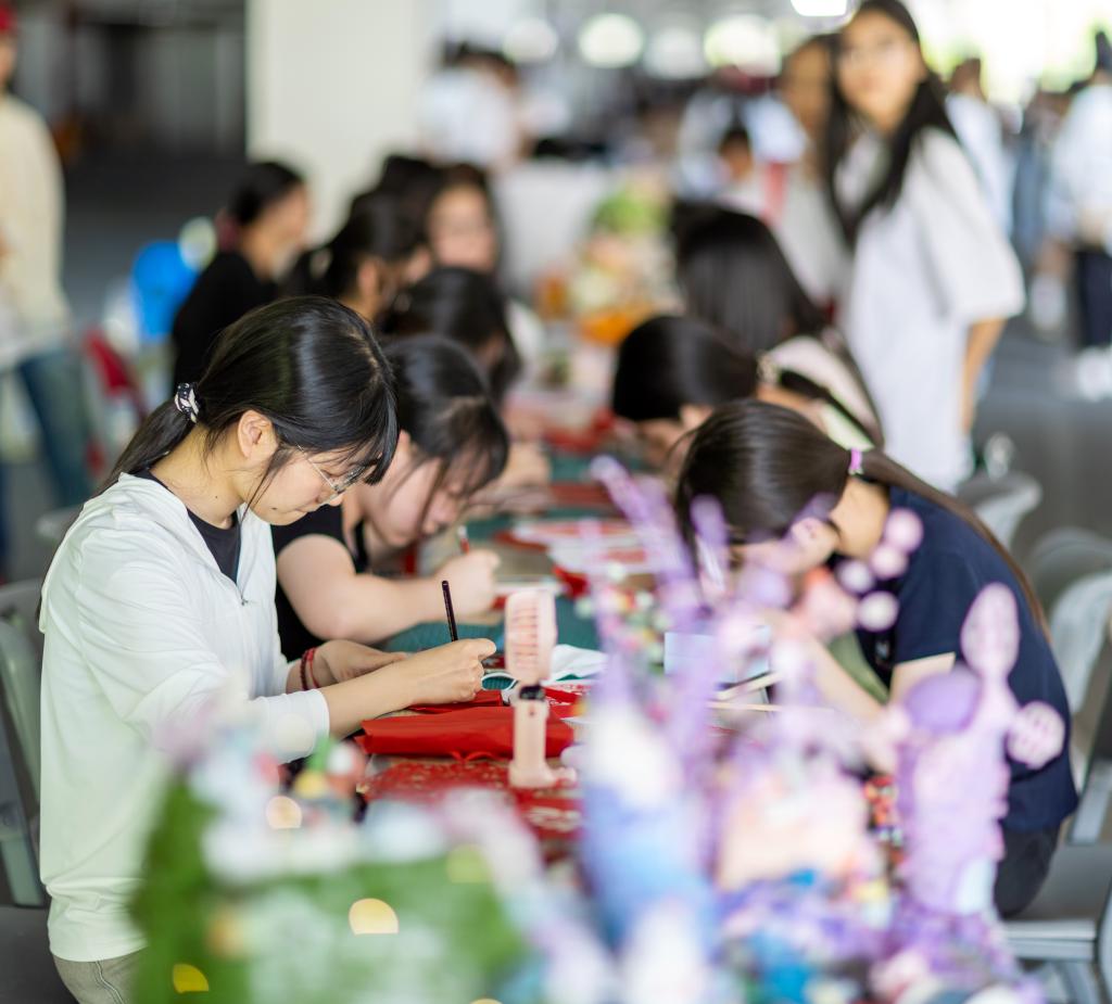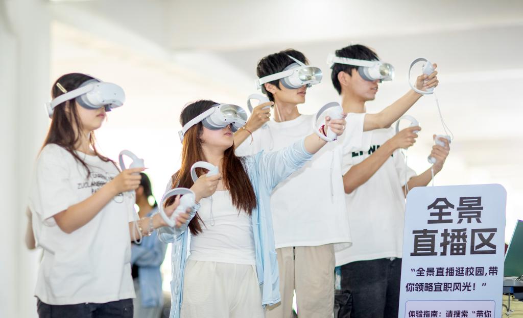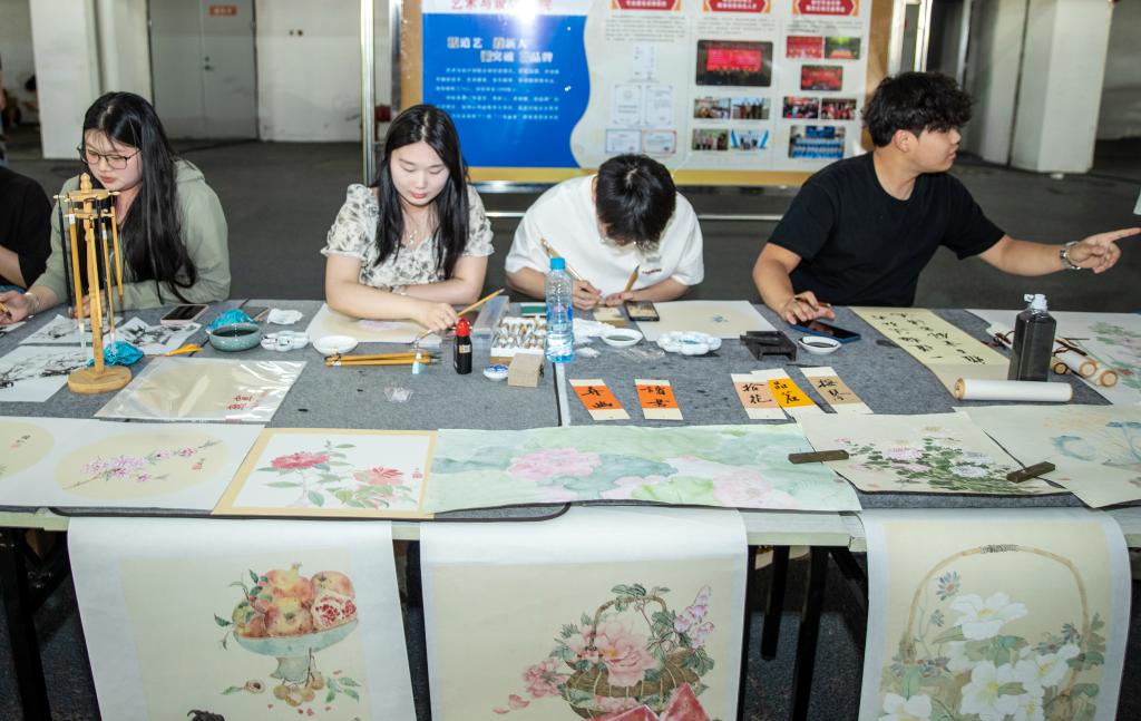 机电与新能源汽车学院进行无人机表演,展出新能源汽车,将实训设备和场景进行情景再现;经济管理学院的雕刻与摆盘、茶艺技能展示吸引众多师生驻足品鉴,展位前人流络绎不绝;信息工程学院AI机器人—“小智”现场吸粉无数,全景直播逛校园、VR体验更是让众多师生沉浸其中;艺术与设计学院扬琴、书法、国画、篆刻等技能,展示了传统文化的独特魅力。