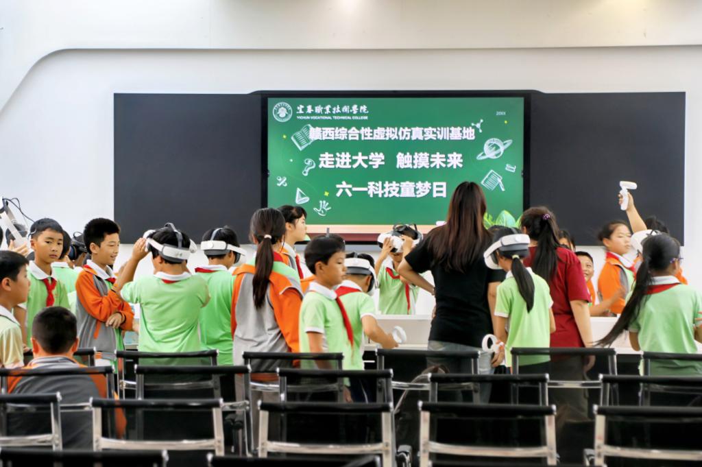 在机电与新能源汽车学院,一场“空中奇遇”让孩子们瞬间沸腾。 一架架形态各异、科技感十足的无人机静静地陈列或低空演示,孩子们的眼睛立刻被点亮,纷纷围拢在展示台和演示区四周,仰着小脸,目不转睛地盯着那些能在空中“跳舞”的机器。走进生命与健康科学馆,精密的人体模型与动态的生理过程演示牢牢抓住了孩子们的目光,在这里他们探寻生命的奥秘。“原来薄荷叶子真的这么清凉!”在中药科技馆,弥漫的幽幽药香引领孩子们步入传统医学的殿堂。来到赣西虚拟仿真实训基地,当戴上VR眼镜,虚拟与现实的无缝切换,让书本上的知识瞬间化作可触可感的立体世界,惊叹声此起彼伏,充满想象力的提问,折射出绿色科技的种子已悄然播撒心田。