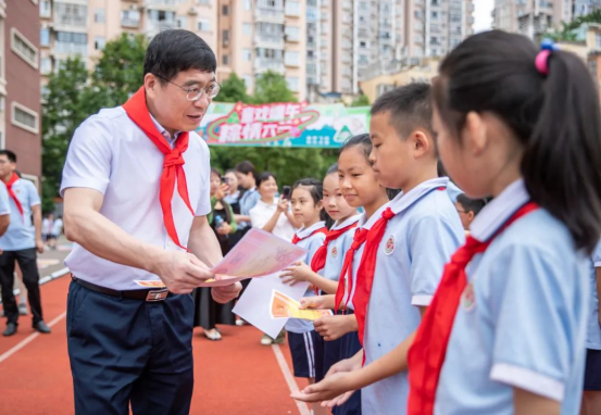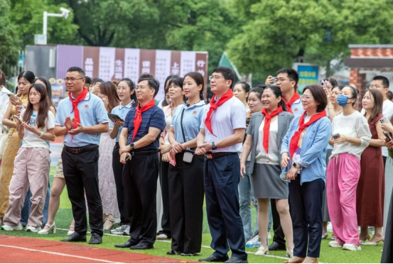 附属小学鼓乐队奏响《迎宾曲》,为他们的到来表示热烈地欢迎。在附属小学校长柳琴的陪同下,一行人驻足观看特色教育成果展板,深入了解学校五育融合的实践成果。随后,精彩纷呈的特色展示轮番上演。动感十足的啦啦操,变幻多样的花样跳绳,奇妙有趣的AI智能体育展示,丰富多彩的课间活动展示等,赢得了大家热烈的掌声。包粽子劳动实践活动,领导们、家长与师生共同体验传统文化,品尝了孩子们亲自包的粽子,将本次活动推向高潮。领导们为“校园之星”颁发奖状、送上礼品,并合影留念。