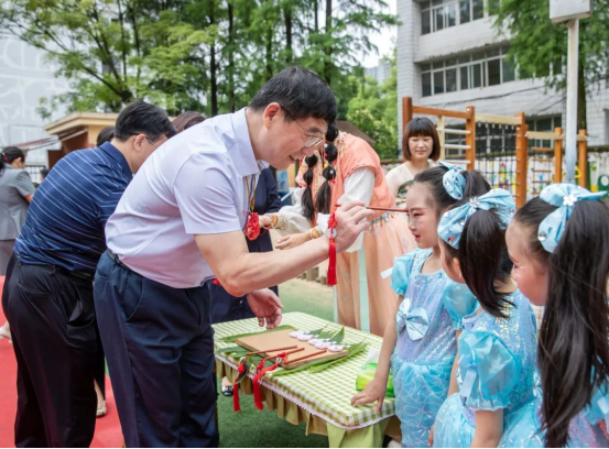刚踏入幼儿园,童趣盎然的节日氛围便扑面而来。在传统民俗体验区,大家一同踏上“菖蒲路”,踩着铺就的菖蒲叶片,感受传统文化的独特韵味。身着飘逸汉服的教师,以优雅的礼仪呈现《沐兰汤·净手纳吉》仪式。孩子们用稚嫩的小手,将自己精心制作的香囊佩戴在伯伯、阿姨胸前,传递纯真的心意。校领导手持点砂笔,在孩子们光洁的额头上轻点朱砂,寓意“朱砂启智”,同时送上“聪慧成长”的美好祝愿。祈福环节中,大家将孩子们写满祝福的卡片高高悬挂,让美好憧憬随风飘扬。移步至班级活动室,校领导驻足观看幼儿区域活动。孩子们在传统文化区、美工区、角色扮演区里尽情发挥。