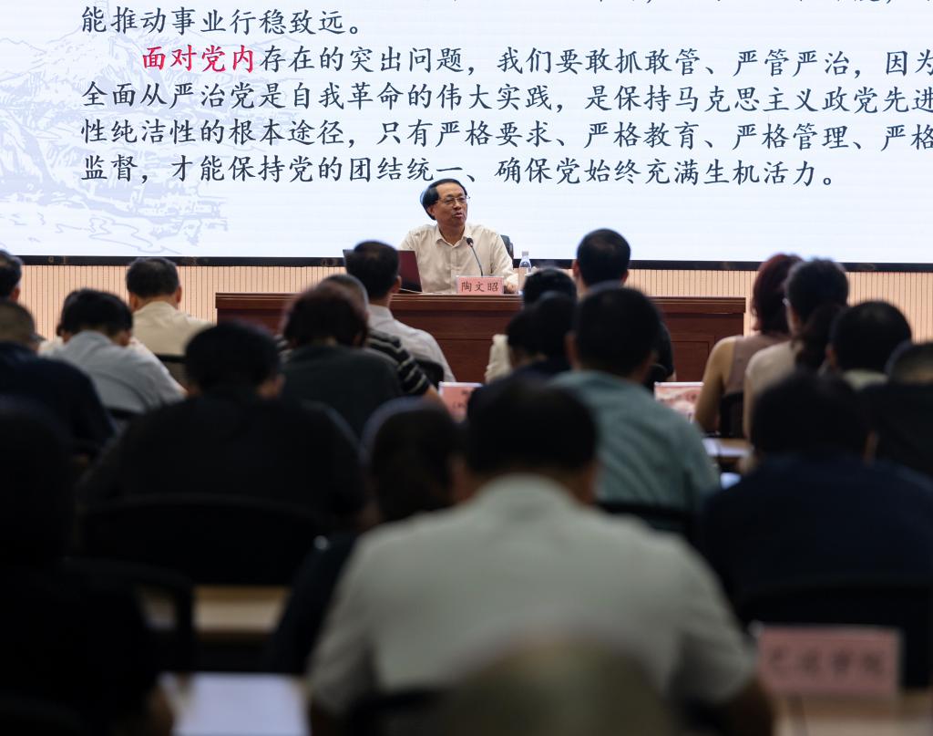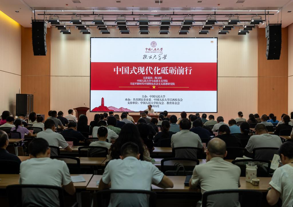 陶文昭围绕《习近平谈治国理政》第五卷,以《中国式现代化砥砺前行》为题,从三个维度带领大家全面把握中国式现代化的理论精髓与实践方向。一是历史维度,从新民主主义革命时期到新中国成立,经改革开放新时期,再到党的十八大以来实现创新突破,中国式现代化每一段征程都凝聚着党和人民的不懈奋斗。二是理论维度,无论是“人口规模巨大、全体人民共同富裕”等五大中国特色,还是“坚持党的领导、实现高质量发展”等九大本质要求,亦或是“顶层设计与实践探索、效率与公平”等六大重大关系,陶文昭教授清晰解码了中国式现代化,让大家明白这一理论体系既扎根中国国情,又蕴含人类文明新思考。三是实践维度。从党的二十大到二十届三中全会,每一项部署都紧扣“以改革推进现代化”的核心逻辑,指明了“干什么、怎么干”的方向。