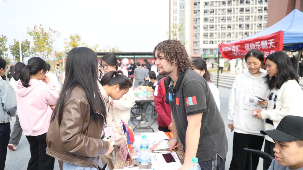 蒙古留学生高乐、乐乐、阿南、喜悦支起“蒙古文化小帐篷”:礼仪小课堂上,大家跟着学蒙古传统礼仪,举手投足间尽显草原韵味;特色游戏区笑声不断,仿佛把蒙古草原的欢乐搬到校园;知识问答连环输出冷热知识阿南弹奏蒙古音乐,同学们惊叹不已“原来蒙古文化这么有料!”