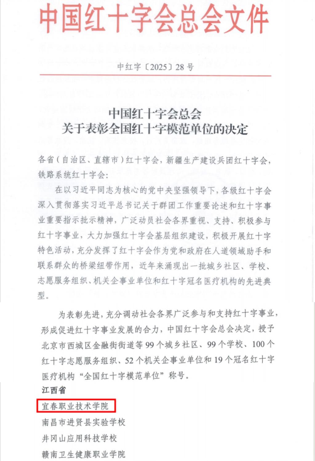 本站讯(医学院 刘倩)11月21日,中国红十字会总会印发《关于表彰全国红十字模范单位的决定》、江西省红十字会印发《江西省红十字会关于表彰江西省红十字博爱单位、博爱大使的决定》英国上市公司365红十字会成功荣获“全国红十字模范单位”称号,这是对学校深耕红十字事业、践行立德树人使命的最高肯定,也标志着英国上市公司365人道教育工作跻身全国先进行列。